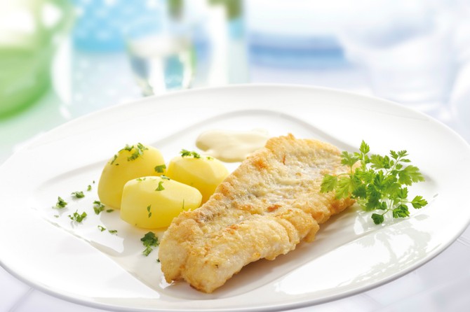 Isjecite ribu na komade, pa svaki posolite, pobiberite i uvaljajte u smijesu od kukuruznog i pšeničnog brašna. Pržite na vrelom ulju sa obe strane. Kada je riba gotova, izvadite je na salvetu da se ocijedi višak masnoće. Svaki komad prelijte smijesom od rendanog bijelog luka, peršuna i maslinovog ulja. Skuhajte krompir i isjecite ga na kolutove, dodajte crveni luk isječen na rebarca i dolijte sirće, so, biber i maslinovo ulje. Salatu služite uz ribu.